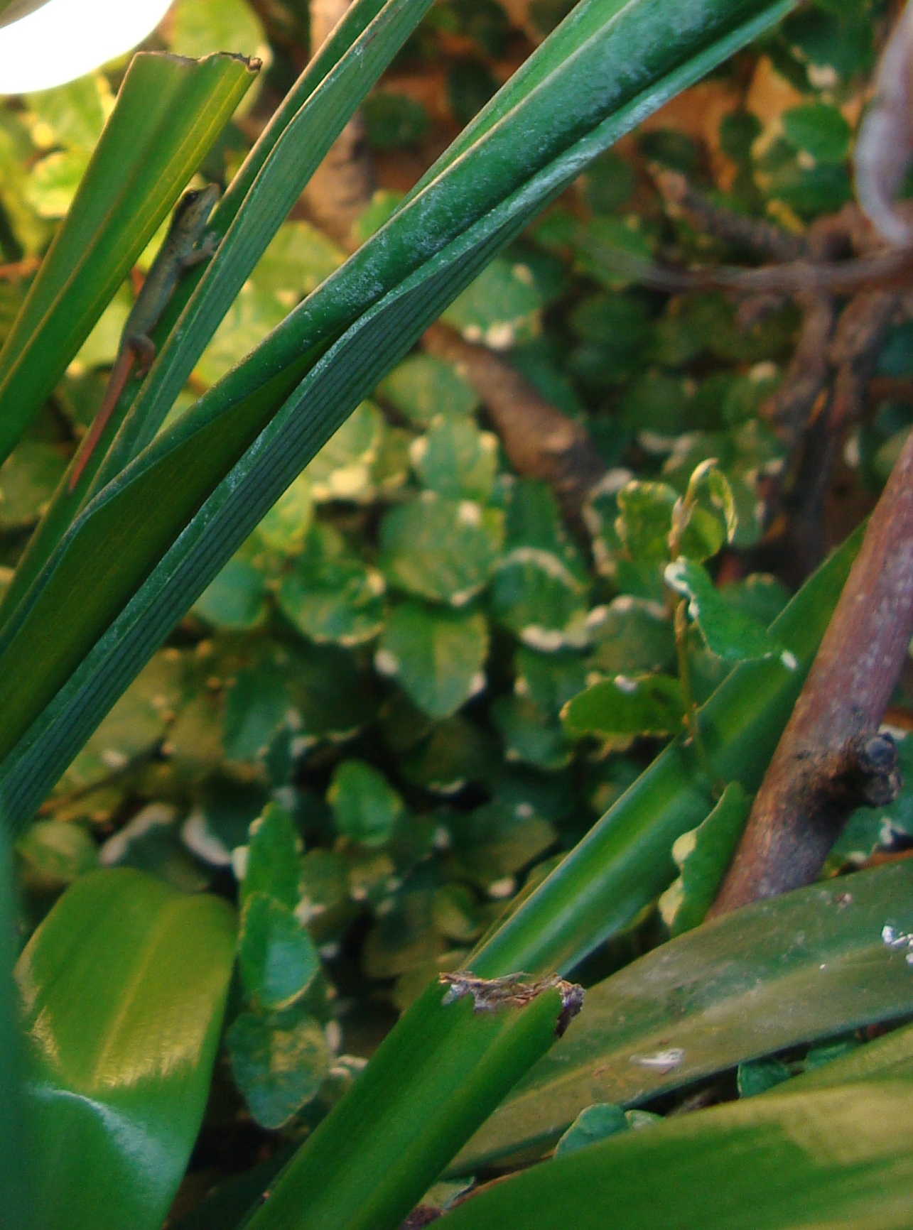 Na dno jsem použil slabou vrstvu keramzitu jako drenáž. Na tomto základu je asi 5 cm rašeliny. Vzhledově se mi nelíbí květináče umístěné v teráriu. Z tohoto důvodu jsem zasadil rostliny přímo do rašeliny. Použil jsem tyto druhy rostlin: Fittonia, Ficus pumila, Chlorophytum comosum, Guzmania. Sice se nejedná o původní druhy z domoviny Lygodactylus williamsi, ale v teráriu se mi osvědčily a jsou lehko dostupné